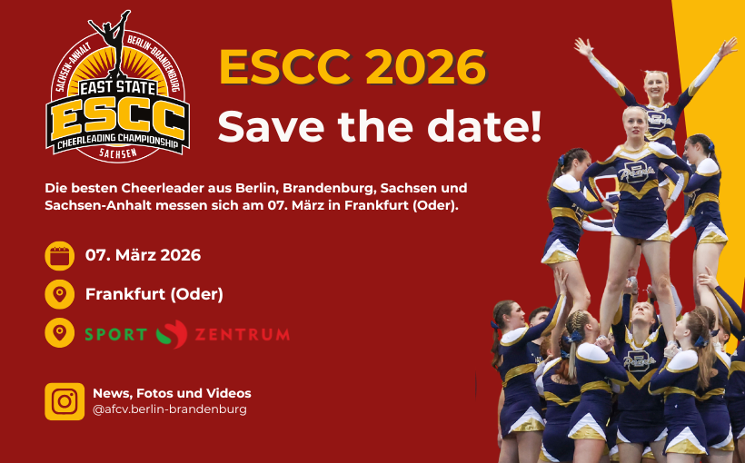 Die East State Cheerleading Championship findet am 07. März im Sportzentrum Frankfurt Oder statt. Die Vorfreude auf die Landesmeisterschaft ist groß und wir freuen uns auf zahlreiche Zuschauerinnen und Zuschauer.